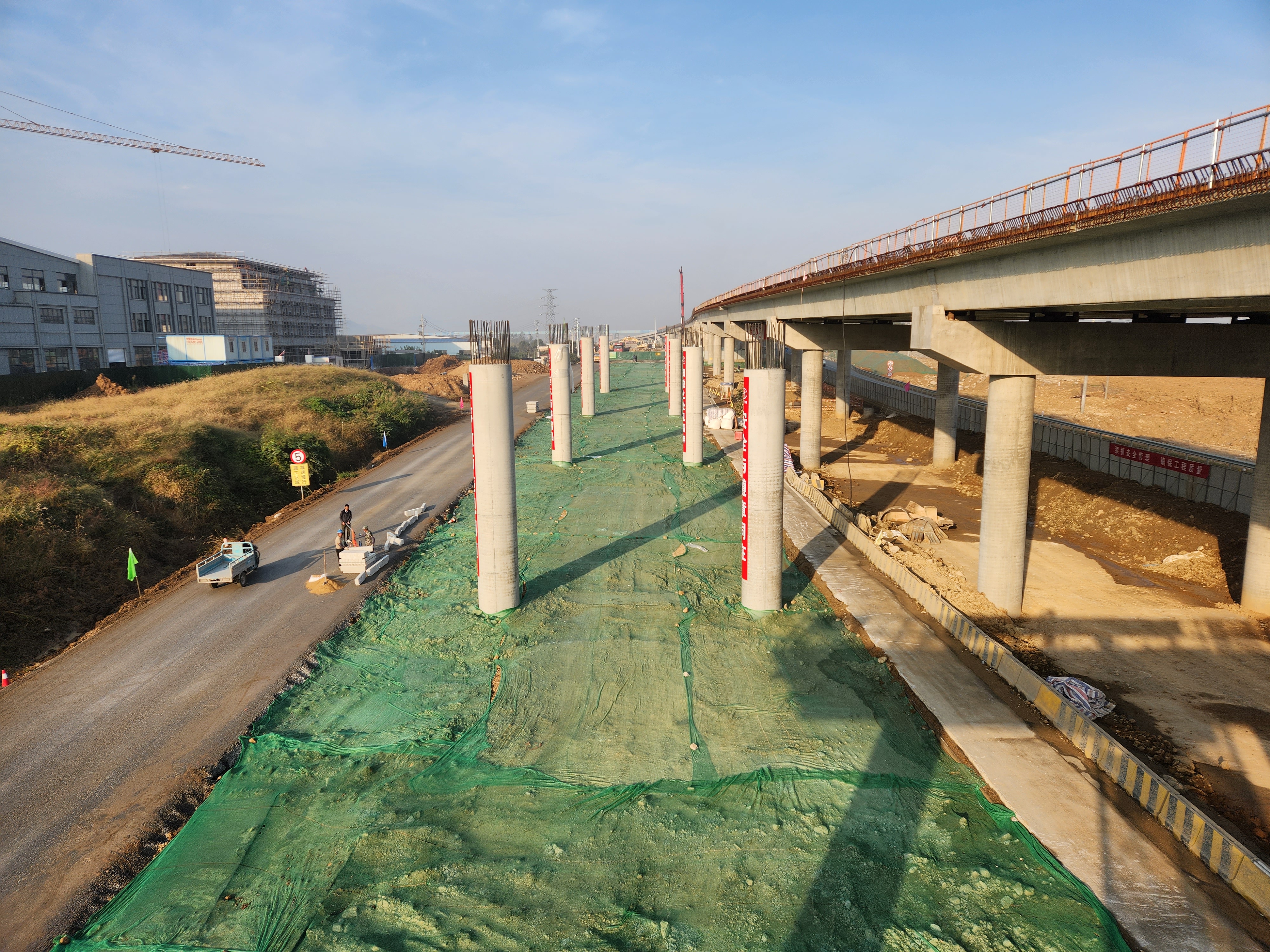 腾龙大道智慧快速路二期工程是构筑常州“中环”的重点项目。项目建成后,对于推动形成网格化快速路网体系,发挥系统功能,实现立体交通,加强城市南北联系方面具有重要作用。江苏交工承建的腾龙大道7标项目全长约4.5千米。目前,全体参建人员有条不紊地进行墩柱施工,项目施工进度步步推进。项目累计完成钻孔灌注桩392根,完成承台8座,完成钢筋加工场、拌和站、预制梁场改建,其中预制梁场已完成验收。