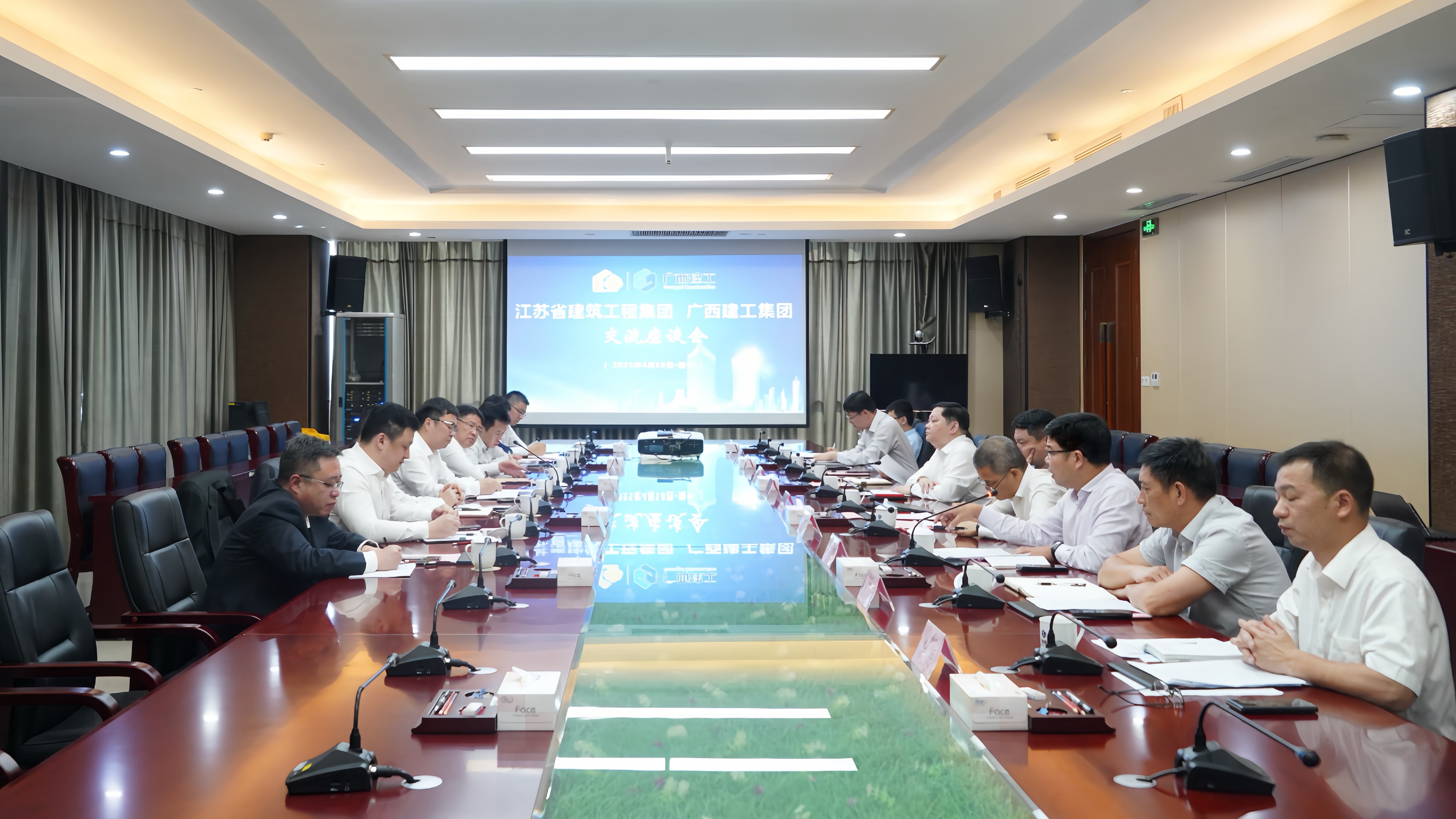 蒋宁对广西建工的热情接待表示感谢,并简要介绍江苏省建近期生产经营情况。他指出,当前建筑市场持续变化,行业都面临着一些共性的挑战,广西建工围绕全年目标,在平台建设、清收清欠、融资信贷、风险化解等方面的优秀经验以及抢抓政策和市场新机遇、应对行业深度调整的有效策略值得江苏省建借鉴和学习。希望双方发挥各自优势,持续开展更深入的交流学习,加强沟通对接,加大业务合作,实现经验共享、互促提升,携手共赢发展。